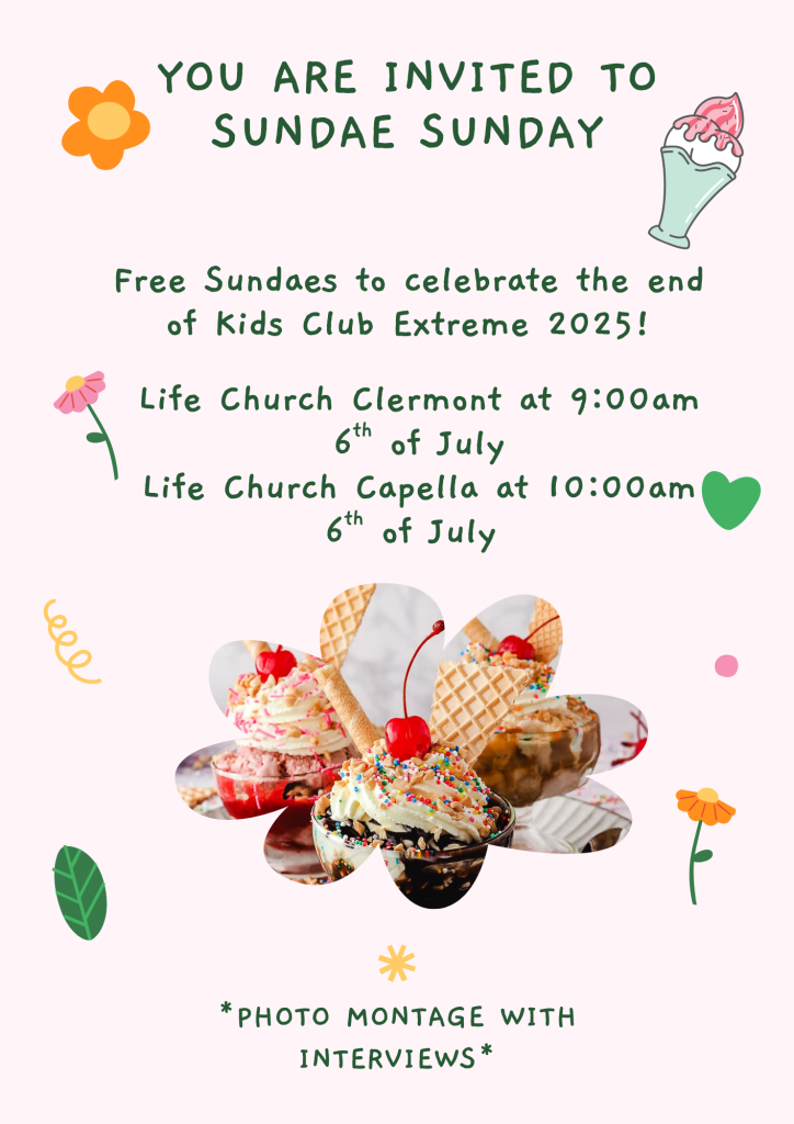 As a part of our Kids Club Extreme program we would love to invite families/carers and friend to enjoy a special Kids Club Extreme themed Sunday Service. This is a chance for the kids to perform songs and dances from camp and we’ll also feature a montage of photos/videos from the three days. It’s a great time to share your child’s experiences with them. We will celebrate with FREE Sundae Ice Creams afterwards.